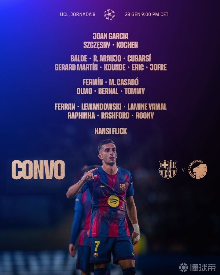 北京时间明天凌晨4点,巴萨将迎来欧冠联赛阶段第8轮对阵哥本哈根的比赛,赛前,巴萨官方公布了本场比赛的大名单,根据巴萨官方的公告,费兰-托雷斯已经获得了医疗部门给予的出战许可。