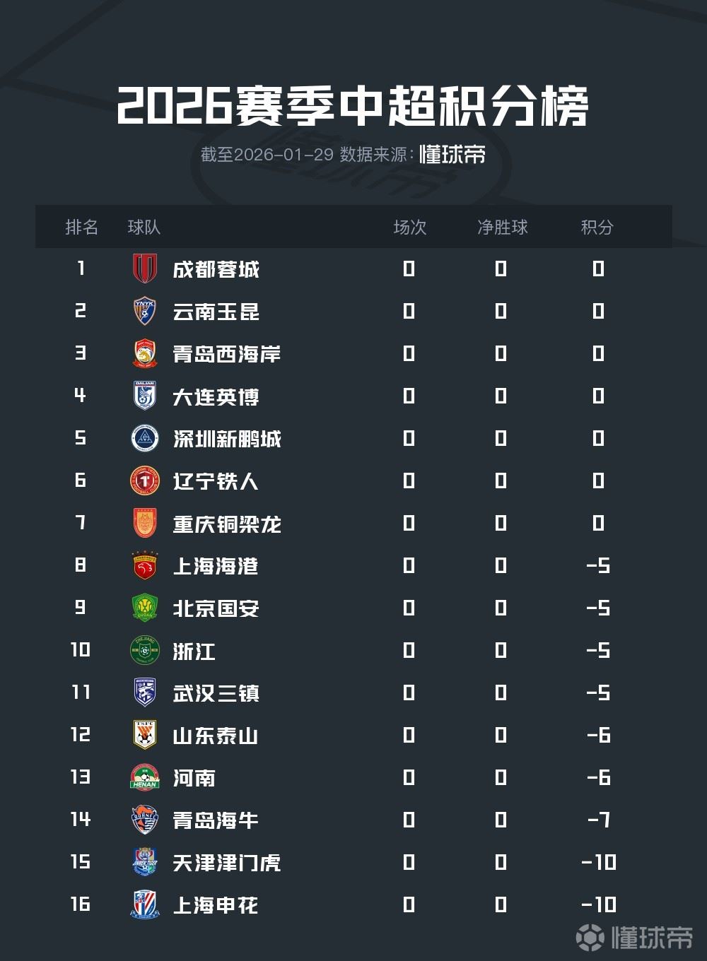 北京时间1月29日,公安部、国家体育总局、中国足协在北京联合召开假赌黑问题专项整治行动新闻发布会。2026赛季中超共有9家俱乐部被罚分,成都蓉城、云南玉昆、青岛西海岸、大连英博、深圳新鹏城、辽宁铁人、重庆铜梁龙等7家俱乐部未被处罚。