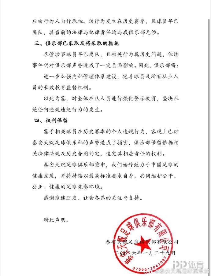 鉴于相关球员在历史赛季的个人违规行为,客观上已对泰安天贶足球俱乐部的声誉造成了损害,俱乐部保留依据相关法律法规及历史合同约定,追究其相应责任的权利。