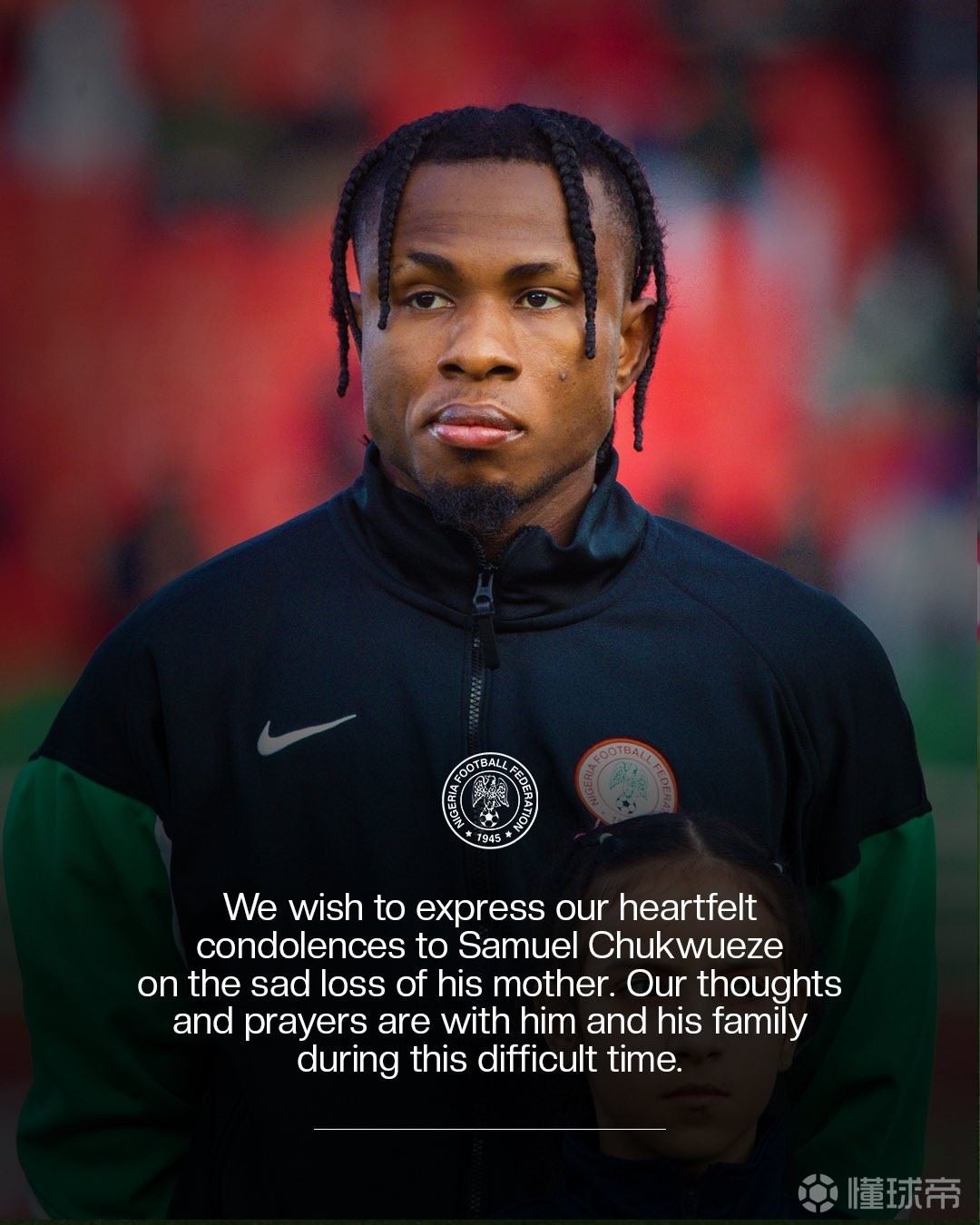 尼日利亚国家队则表示:得知塞缪尔-丘库埃泽的母亲不幸离世,我们深感悲痛,向他及家人致以最诚挚的慰问。在此艰难时刻,我们与他们同在,并为他们祈福
