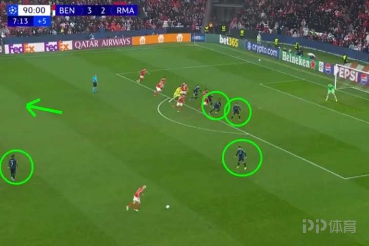 画面中,维尼修斯和姆巴佩在中场,迪亚斯孤身站在距球门40米处充当“人墙”,在皮球开出后,贝林厄姆和卡马文加仍停留在近处进行防守站位,真正退防的只有赛斯特罗、阿拉巴和巴尔韦德三人。