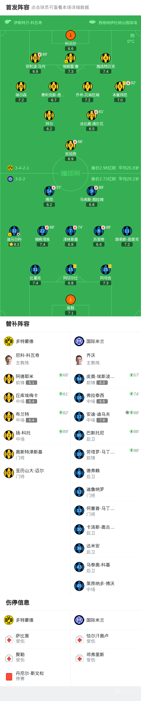 北京时间1月29日4:00,欧冠联赛阶段第8轮,多特蒙德坐镇西格纳-伊杜纳公园球场迎战国际米兰,本场主裁判为伊斯特万-科瓦奇。上半场,吉拉西错失良机。下半场,迪马尔科任意球世界波打破僵局,安迪-迪乌夫一条龙破门锁定胜局。最终,国米2-0客胜多特,两队均进入淘汰赛附加赛。