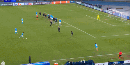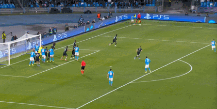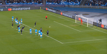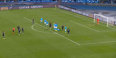 但在这次任意球的主罚过程中,那不勒斯送上了手球犯规,于是任意球直接变成了点球: