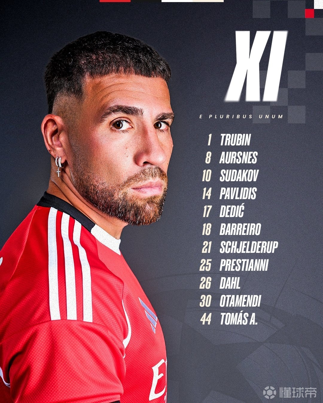 本菲卡首发:1-特鲁宾、17-德迪奇、44-阿劳若、30-奥塔门迪、26-达尔、18-巴雷罗、8-奥尔斯内斯、25-普雷斯蒂安尼、10-苏达科夫、21-谢尔德鲁普、14-帕夫利季斯