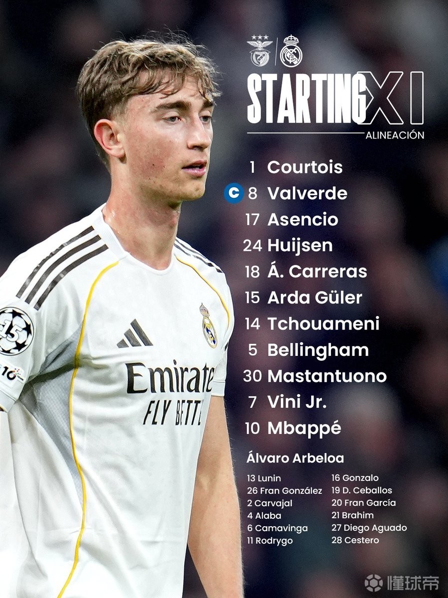 皇家马德里首发:1-库尔图瓦、8-巴尔韦德、17-阿森西奥、24-赫伊森、18-卡雷拉斯、15-居莱尔、14-楚阿梅尼、5-贝林厄姆、30-马斯坦托诺、7-维尼修斯、10-姆巴佩