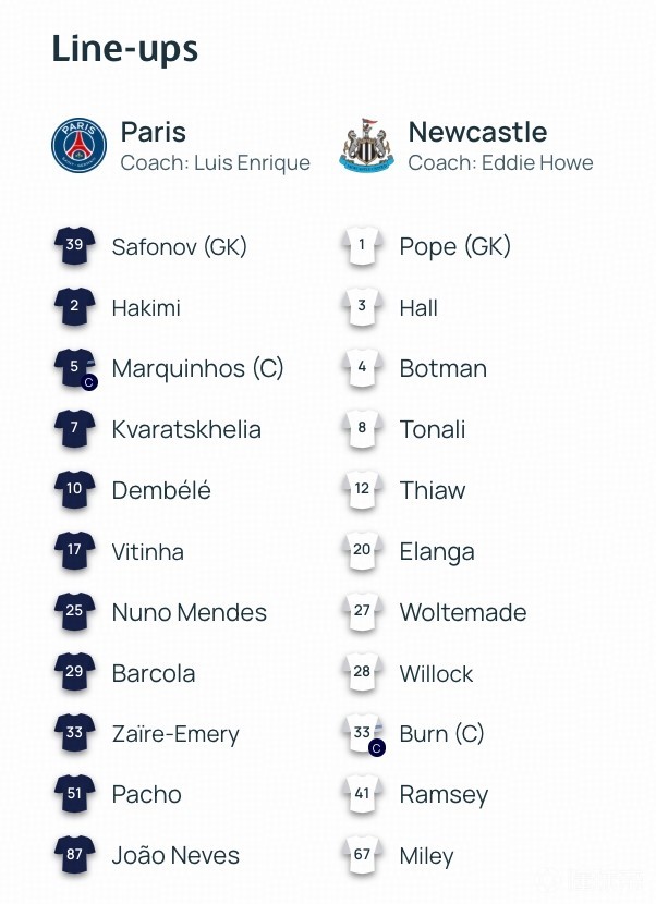 巴黎首发:39-萨福诺夫、2-阿什拉夫、5-马尔基尼奥斯、51-帕乔、25-门德斯、33-扎伊尔-埃梅里、17-维蒂尼亚、87-若昂-内维斯、7-克瓦拉茨赫利亚、10-登贝莱、29-巴尔科拉