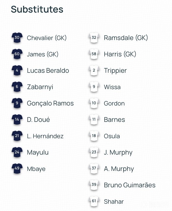 替补:4-贝拉尔多、6-扎巴尔尼、9-贡萨洛-拉莫斯、14-杜埃、21-卢卡斯-埃尔南德斯、24-马尤卢、30-舍瓦利耶、49-姆巴耶、60-马丁-詹姆斯